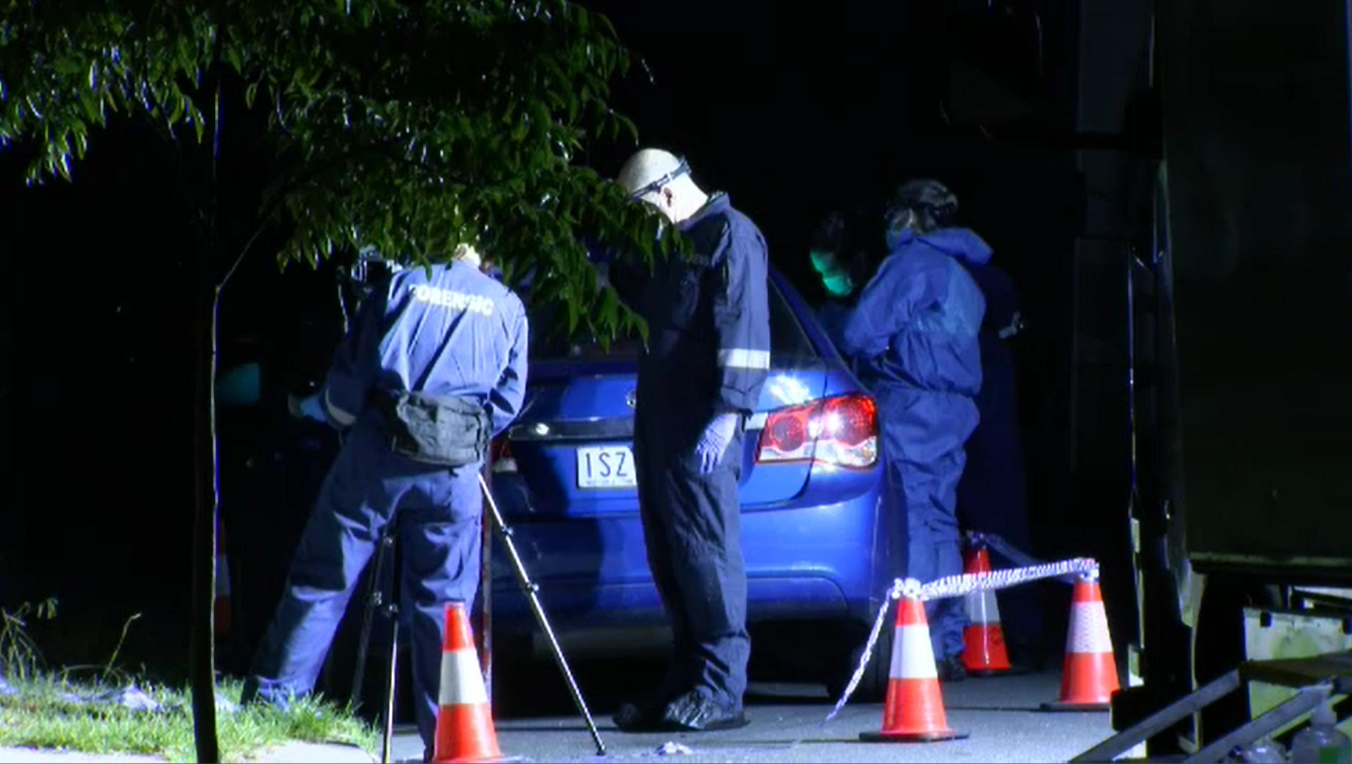 A crime scene has been established, with investigators working throughout the night.