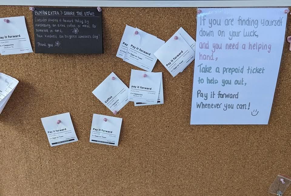 The board is pinned with receipts for drinks or meals paid in advance by customers wanting to pay it forward.